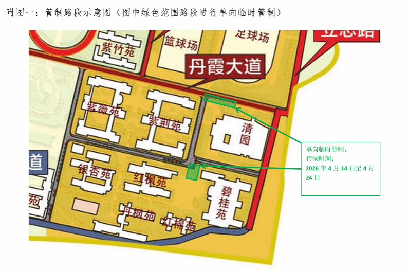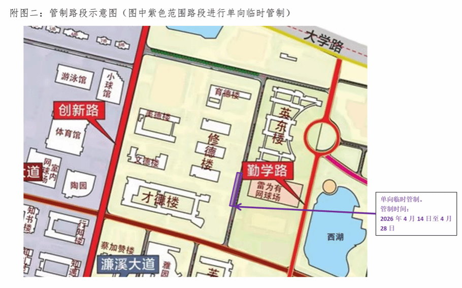 二、在2026年4月14日至2026年4月28日(共计15天全天),对韶乐园明德区修德楼周边道路的部分路段进行临时交通管制,具体位置详见附图二。
