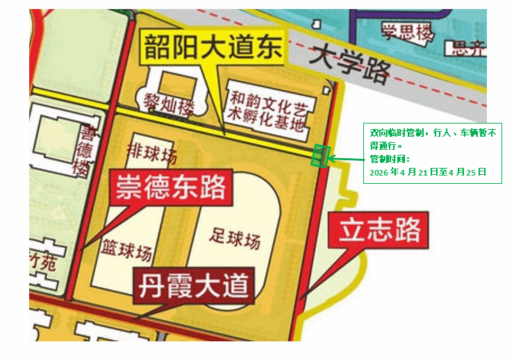为做好韶乐园污水管网维修工作,我部计划在2026年4月21日至2026年4月25日(共计5天全天),对韶乐园善美区和韵文化艺术孵化基地南侧道路的部分路段进行临时交通管制,具体位置详见附图。