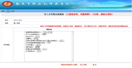 3.课程信息核对无误后,点击“进入评教”开始评教,进入评教后,如发现因网络异常导致课程信息异常的,可在再次重新导入课程。