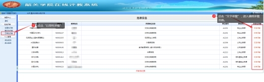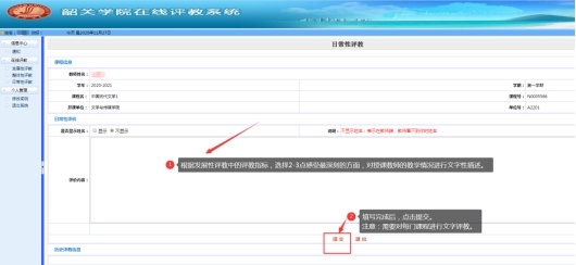 6.第三部分评教——日常性评教:单击系统左侧“日常性评教” → 单击对应课程的“文字评教” → 根据发展性评教中的评价指标,选择2-3点感受最深的优缺点,对课程教学情况进行文字描述(请认真阅读发展性评教中的评价指标,不发表与教学评价不相关的言论) → 单击“提交” → 完成第三部分评教(注意:需要对每门课程进行文字评教)