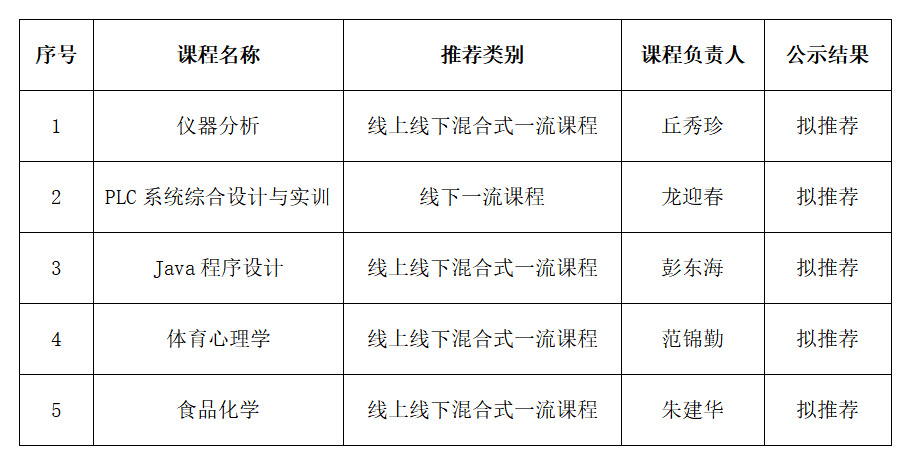 根据《教育部办公厅关于开展第三批国家级一流本科课程认定工作的通知》和《广东省教育厅关于遴选推荐第三批国家级一流本科课程的通知》文件精神,学校组织开展了第三批国家级一流本科课程的遴选推荐工作。经个人申报、二级单位推荐、校内相关部门审核、专家评审、学校教学委员会评议,拟推荐5门课程(其中线下课程1门、线上线下混合课程4门)上报广东省教育厅参与第三批国家级一流本科课程的评选,现予以公示。