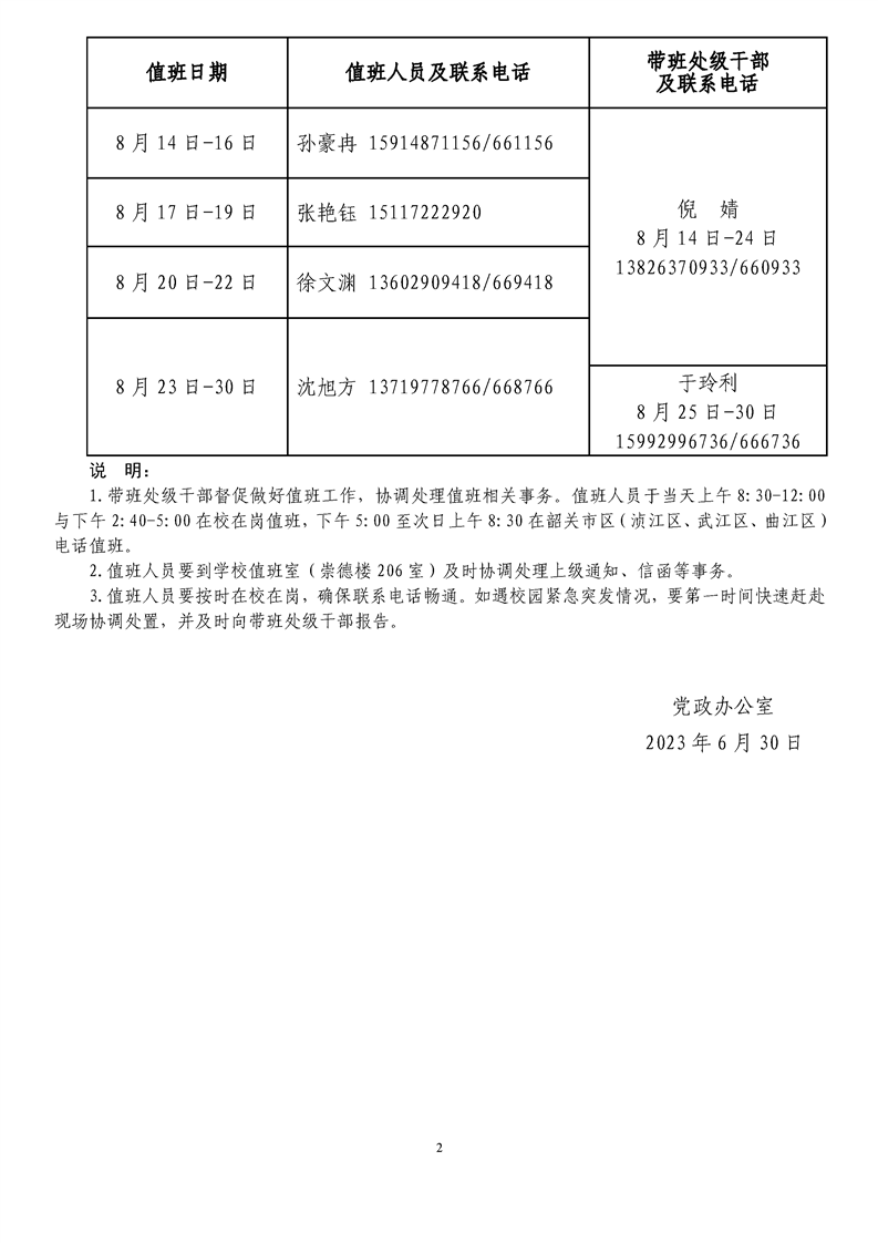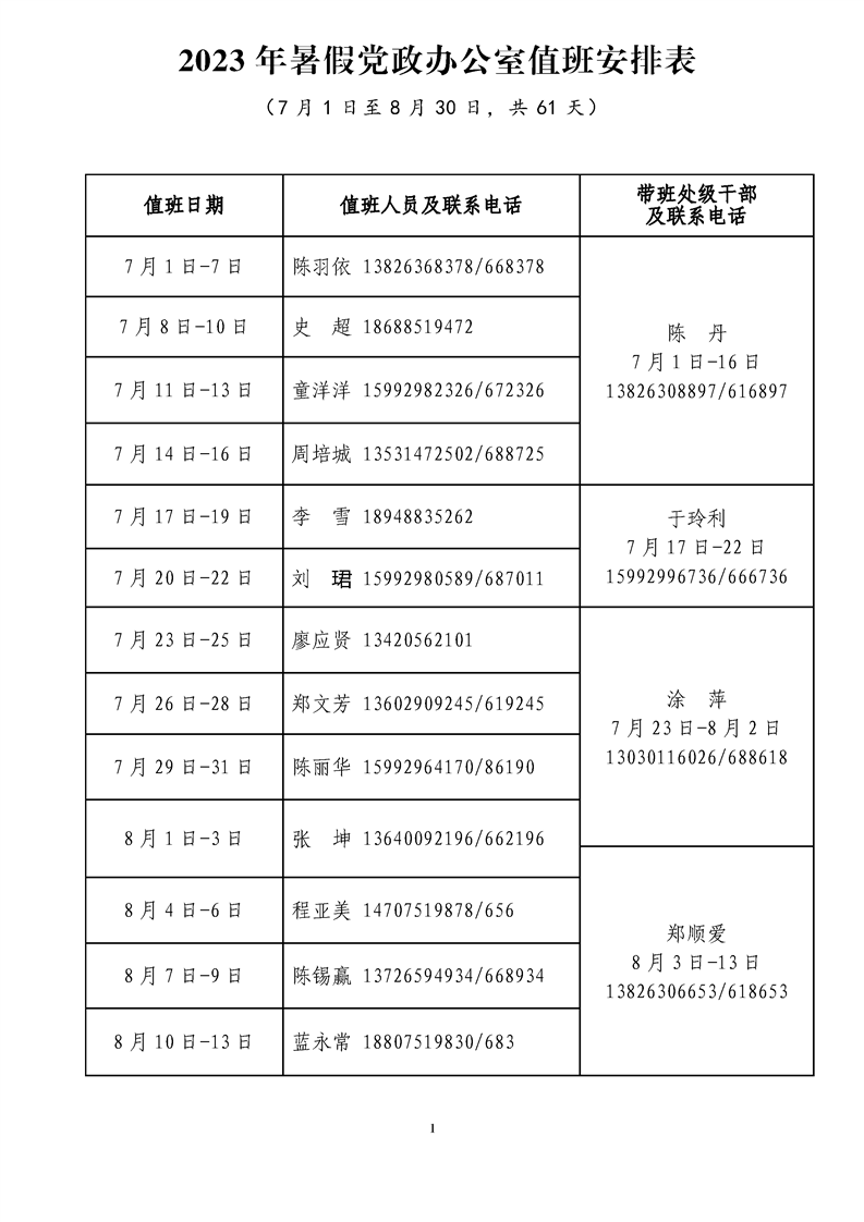2023年暑假党政办公室值班安排表