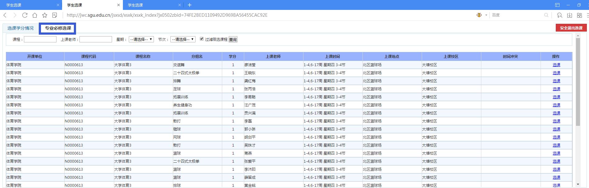 4.大学体育课程是专业培养方案中的必修课,每个同学们务必按通知要求进行选课。选课采用即选即得方式,一旦选定课程不得更改。选课时间结束前还没有选到课的同学将视为自动放弃选课,不得再选。