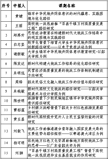 根据2023年专项工作安排,学校组织开展了2023年度韶关学院统战理论研究课题的申报、审查、评审等工作,具体由组织统战部、科学技术部共同组织实施。现对2023年度韶关学院统战理论研究课题拟立项名单予以公示。公示期为2023年5月24日至26日。