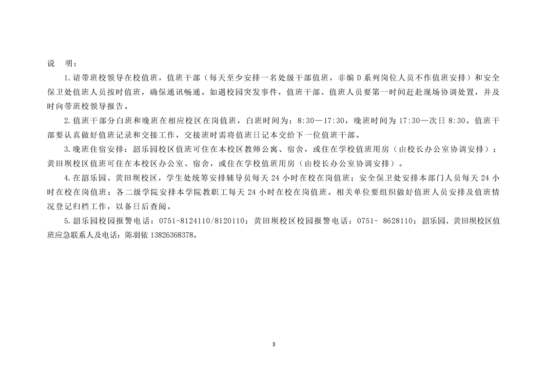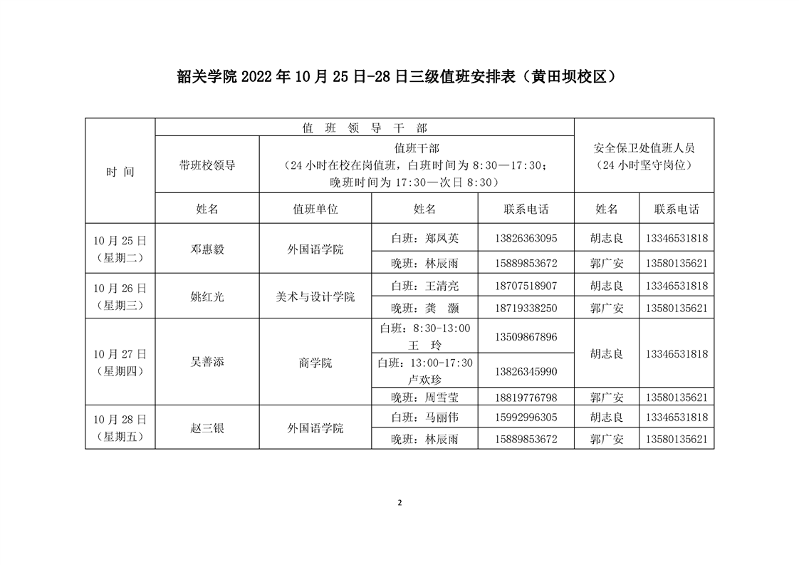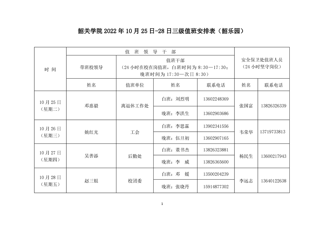 韶关学院2022年10月25日-28日三级值班安排表