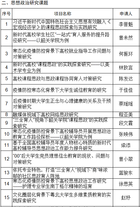 根据年度工作安排,学校组织开展了2022年度韶关学院党建与思想政治研究课题申报工作。经教师个人申报、所在单位推荐、专家组评审,现将拟立项名单予以公示。公示期为2022年9月6日至8日。