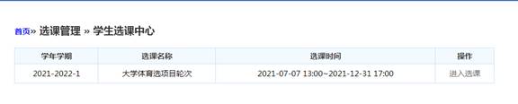 1.学生选课中心—大学体育选项目轮次—进入选课