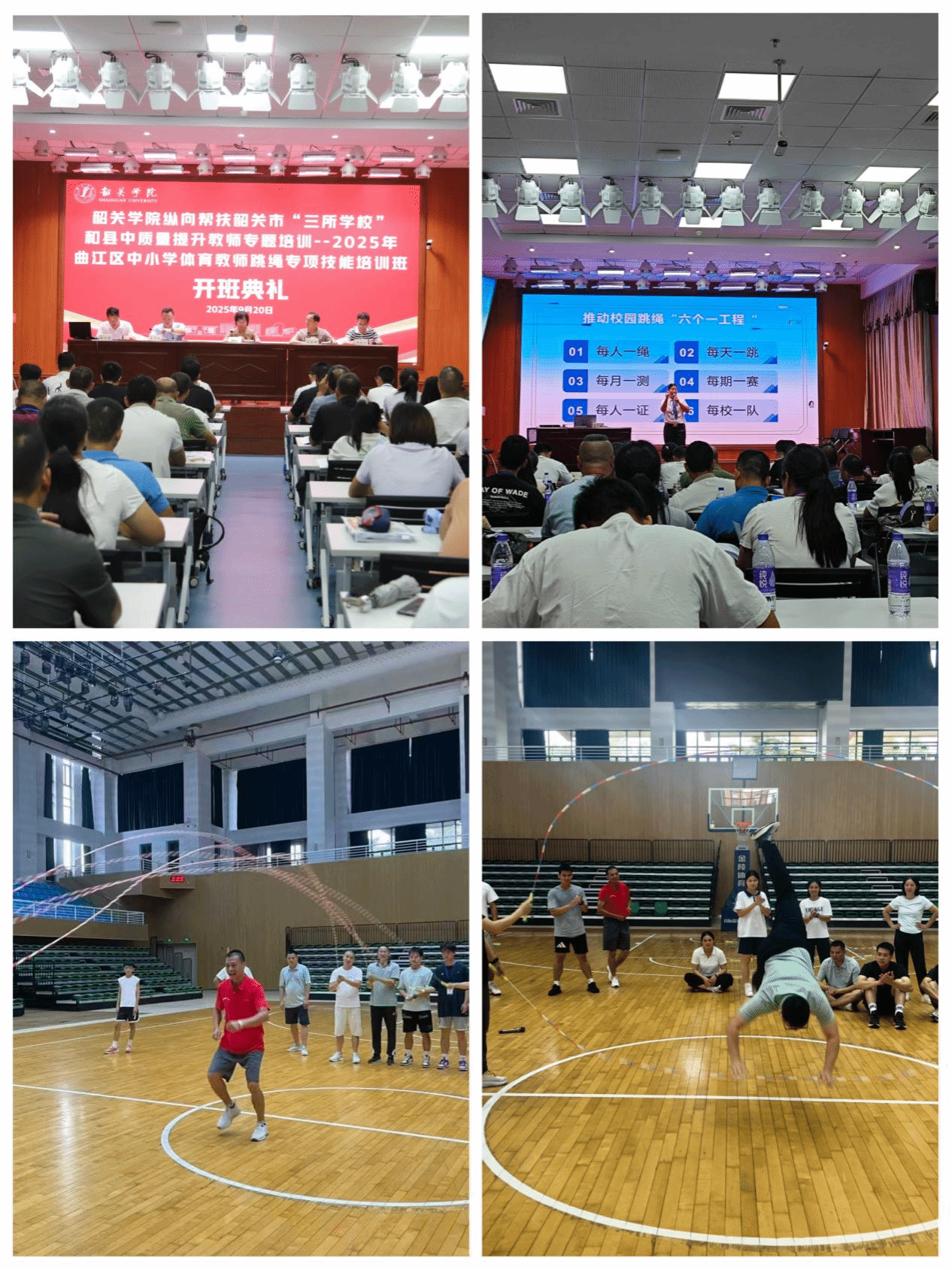 为全面落实《广东省“百县千镇万村高质量发展工程”教育行动方案》,提升曲江区“三所学校”及县中体育与健康教师的专业素养,推动区域体育教育高质量发展,9月20-22日,由体育学院与韶关市曲江区教师发展中心联合举办的“2025年曲江区小学体育教师跳绳专项技能培训”在韶关学院顺利开展,共有60名学员参加本次培训。