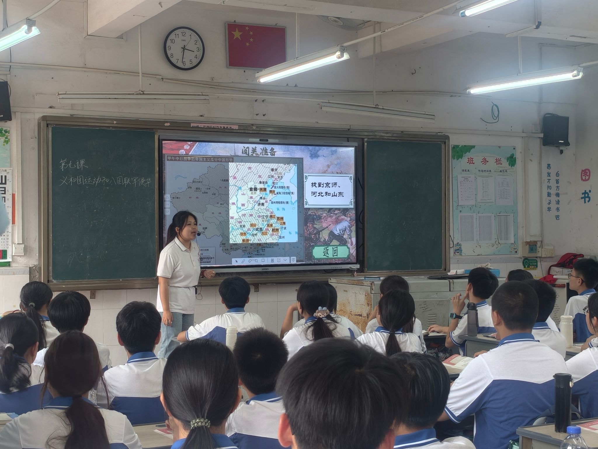 实践队围绕“AI+物理”“AI+地理”“AI+历史”三大主题,分别设计了《物体的快慢》《地球的公转》《义和团运动和八国联军侵华》三节融合AI技术的创新课程。队员们利用多媒体课件、互动软件和虚拟仿真工具,生动形象地展示了AI技术在教学中的辅助作用,激发了八年级学生的学习兴趣和课堂参与度。