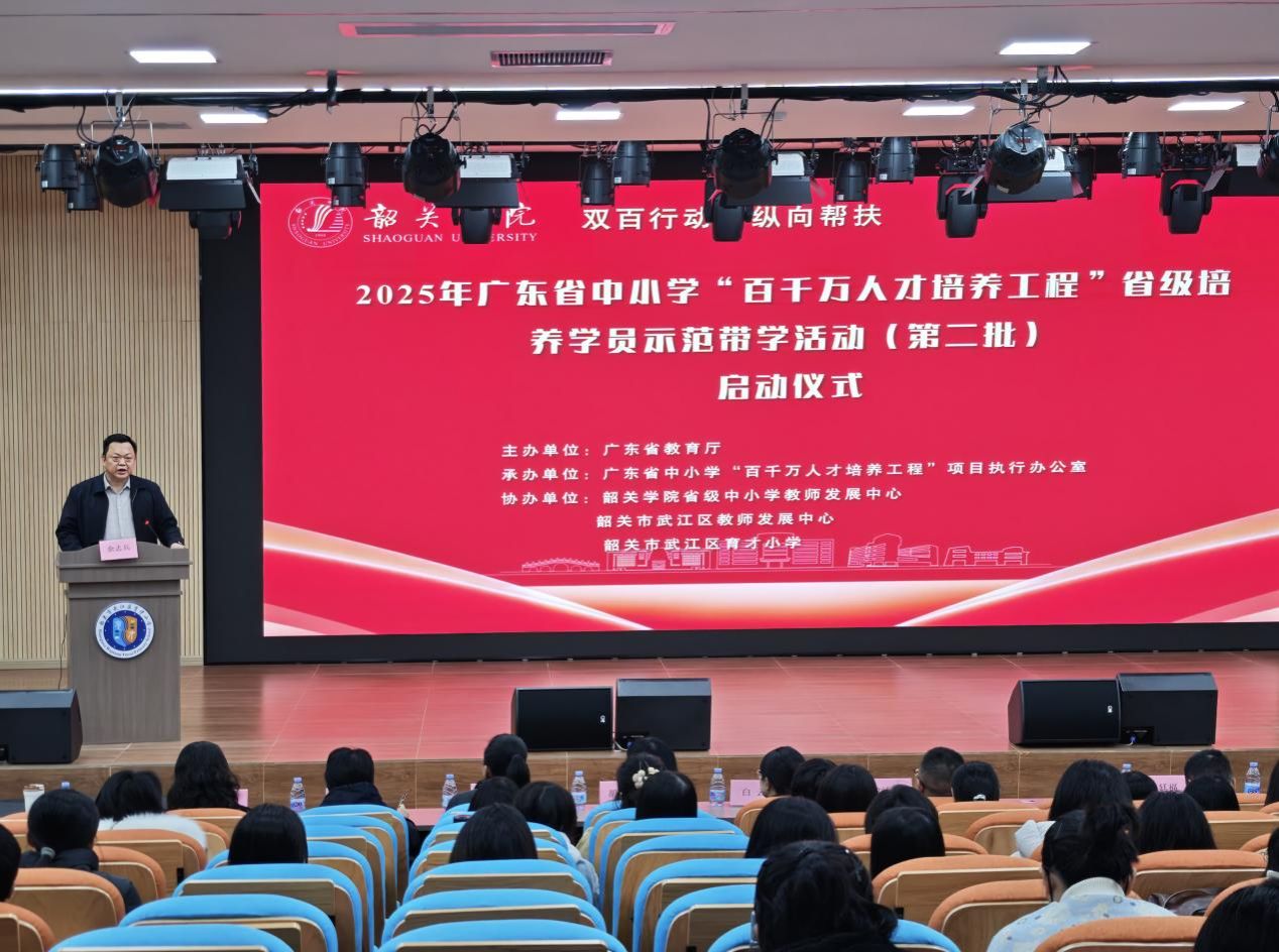 11月18日,由广东省教育厅主办,韶关学院省级中小学教师发展中心协办的2025年广东省中小学“百千万人才培养工程”省级培养学员示范带学活动(第二批)启动仪式顺利举行。活动以“大力弘扬教育家精神,加强新时代高素质专业化教师队伍建设”为主题,上午在韶关市武江区育才小学、下午在南雄中学同步开展,全程通过直播形式实现两地联动,让更多教育工作者共享启动盛况。