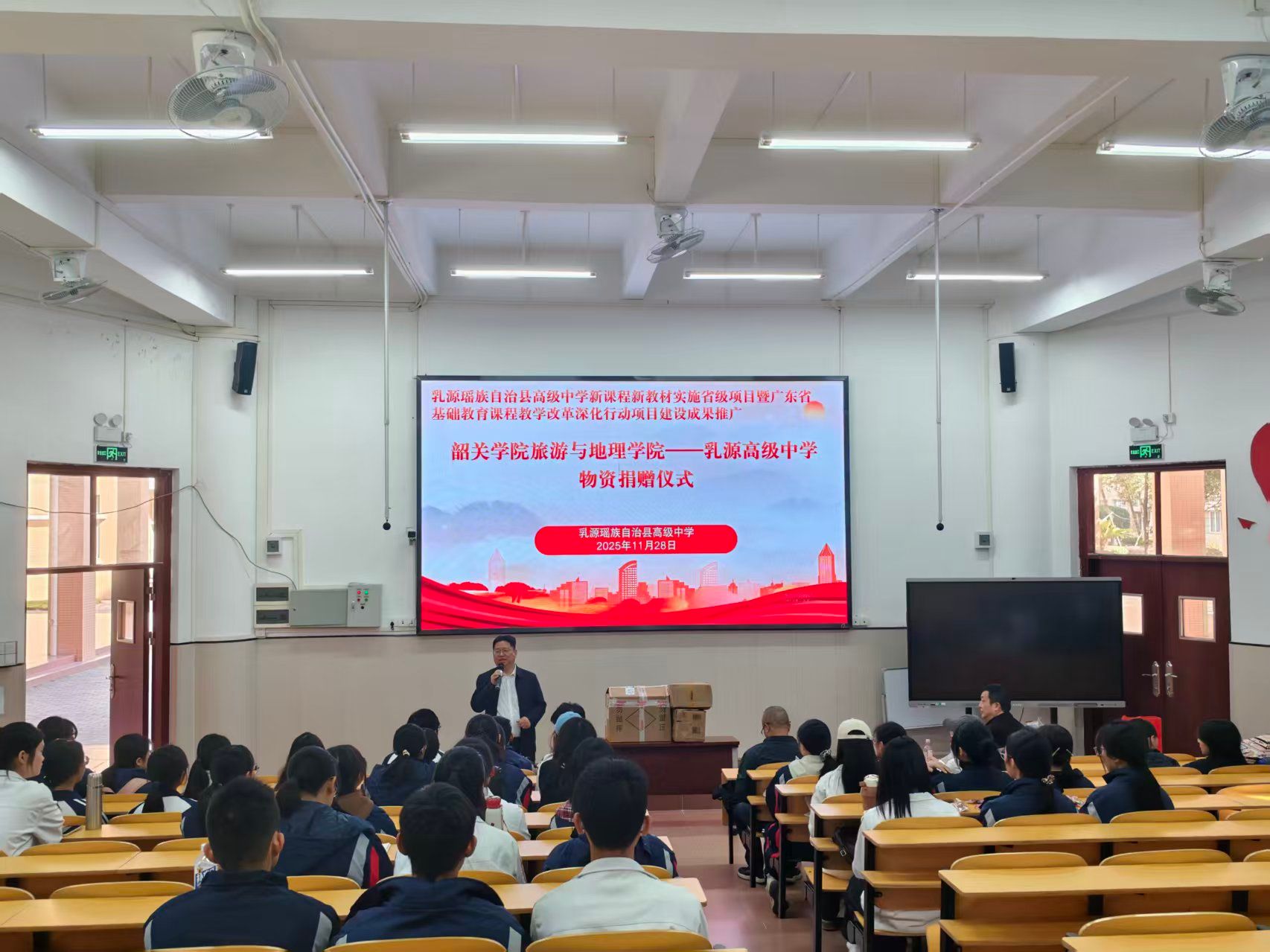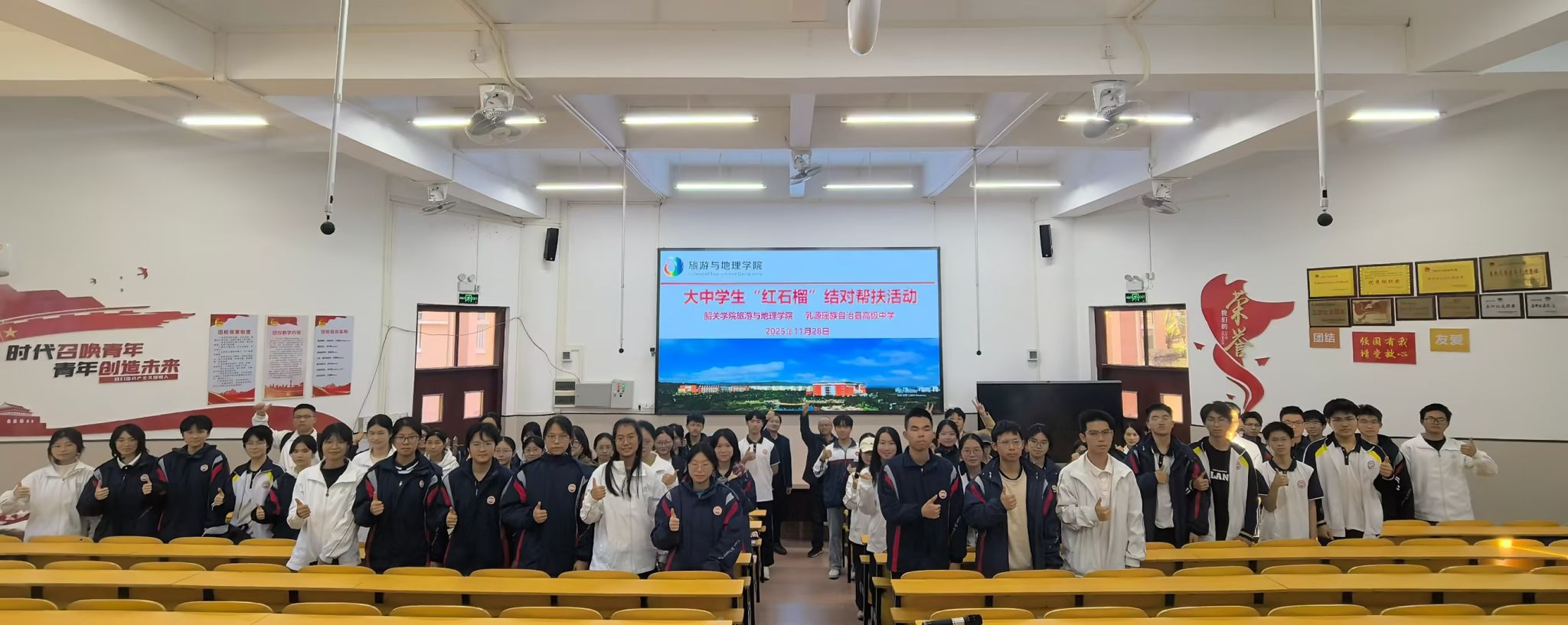 11 月 28 日,旅游与地理学院党委书记曾裕华率该院“红石榴” 志愿服务队一行赴乳源瑶族自治县高级中学开展结对帮扶活动,与该校高中学生共同开展结对帮扶活动,搭建校地学子交流桥梁,传递成长力量,助力少数民族地区高中学生发展。旅游与地理学院党委副书记肖著华、辅导员王玉珊、黎梓浩和18名学生志愿者参加了活动。