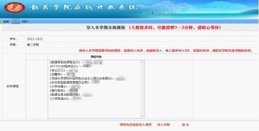 3.课程信息核对无误后,点击“进入评教”开始评教,进入评教后,如发现因网络异常导致课程信息异常的,可在再次重新导入课程。