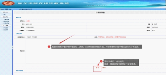 → 单击对应课程的“文字评教” → 根据发展性评教中的评价指标,选择2-3点感受最深的优缺点,对课程教学情况进行文字描述(请认真阅读发展性评教中的评价指标,不发表与教学评价不相关的言论)