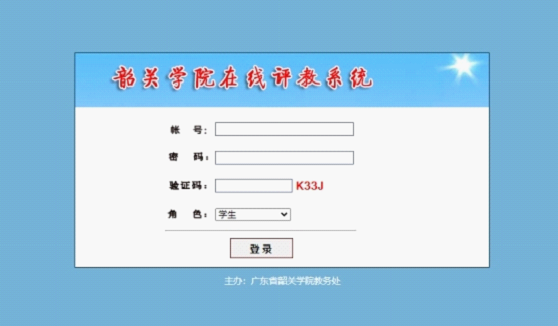 使用校内IP网络登陆“韶关学院在线评教系统”(http://yjcg.sgu.edu.cn/pj/login.aspx),登陆界面如下: