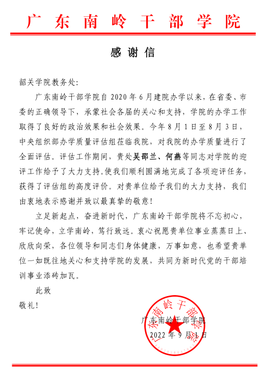 近日,广东南岭干部学院发来感谢信,对我单位给予其办学质量评估工作的大力支持表示感谢。今年上半年,中央组织部对广东南岭干部学院开展了办学质量评估。期间,吴邵兰、何燕等同志发挥所能,全力支持并积极参与迎评工作,使其顺利圆满地完成了各项迎评任务,获得了中央组织部评估组的高度评价。广东南岭干部学院对此表示感谢和敬意,并表达了共同为新时代党的干部培训事业添砖加瓦的愿望。