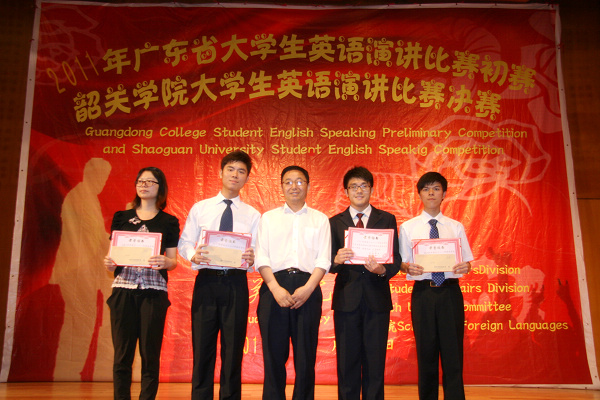 5月18日下午,2011年韶关学院大学生英语演讲比赛决赛暨广东省大学生英语演讲比赛初赛在我校音乐厅举行。此次大赛由学校教务处、学生处、团委主办,外语学院承办。副校长徐剑及相关部门领导出席本次比赛,外语学院贾婷婷等6位老师以及外教Alex担任此次比赛的评委。