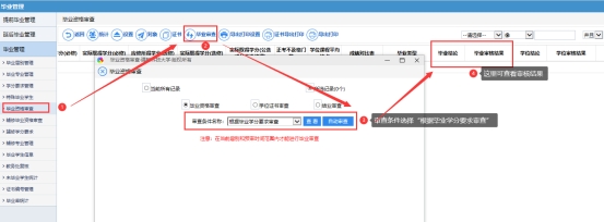 (4)统计结束后,可点击毕业审查,下拉选择“根据毕业学分要求审核”,点击自动审查。审查结束后,可查看毕业审核结果。