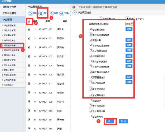 (3)在毕业资格审查模块,选择单位、年级、专业,点击查询,进入页面后,选中全部记录,点击统计,勾选统计选项(专业课程模块、通识选修课程模块、课程体系、学分完成情况统计、创新学分统计、学位课程平均绩点等),然后点击“统计”,等待统计结果。统计结果出来之后,即可查看每一位学生学分修得情况。