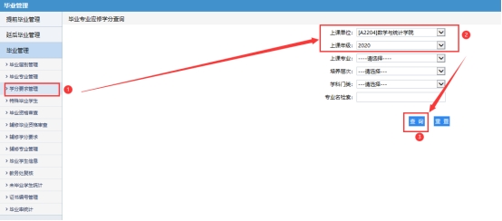 (1)学分要求管理→选择上课单位、上课年级→点击查询→统计→上课单位→统计。如下图:
