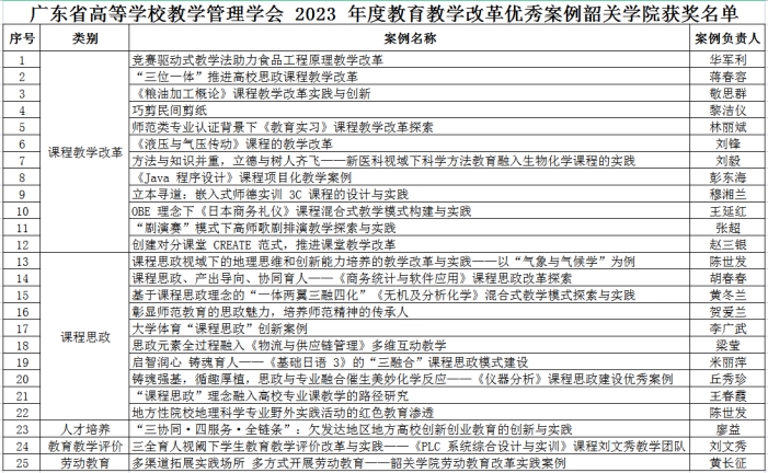 根据《广东省高等学校教学管理学会关于征集2023年度高校教育教学改革优秀案例的通知》(粤高校教管学会〔2023〕3号),全省共评选出教育教学优秀案例 616 个(详见附件)。韶关学院获评优秀案例25个,其中课程教学改革优秀案例12个,课程思政优秀案例10个,人才培养优秀案例1 个,教育教学评价优秀案例1个,劳动教育优秀案例1个。我校同时获评为优秀组织单位。