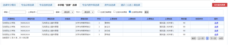 “本学期“挂牌”选课”是依据学校教学改革等要求开设的混合教学班,里面呈现的是学生所在学院本学期所开设的专业必修课(如马克思主义基本原理等),没呈现的课程必须按课程名称等查询条件进行查询。