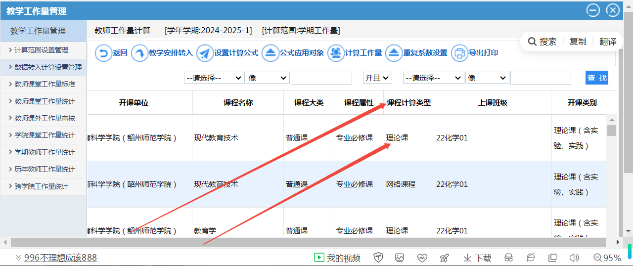 另外,课程计算类型一定要赋值,比如理论课、网络课或其它类型等,不能空置,否则该课程工作量无法统计,如下图: