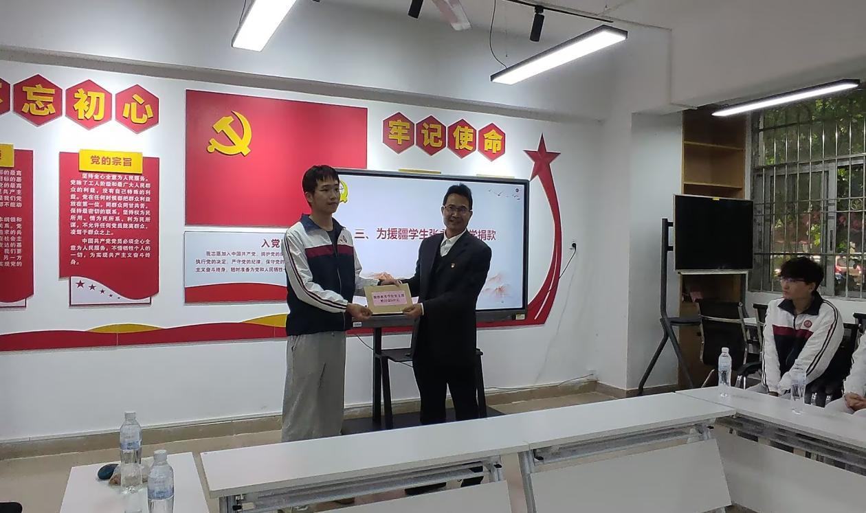 最后,范文明代表支部全体党员、发展对象、积极分子向数学与统计学院支教学生张永锌捐赠慰问金。