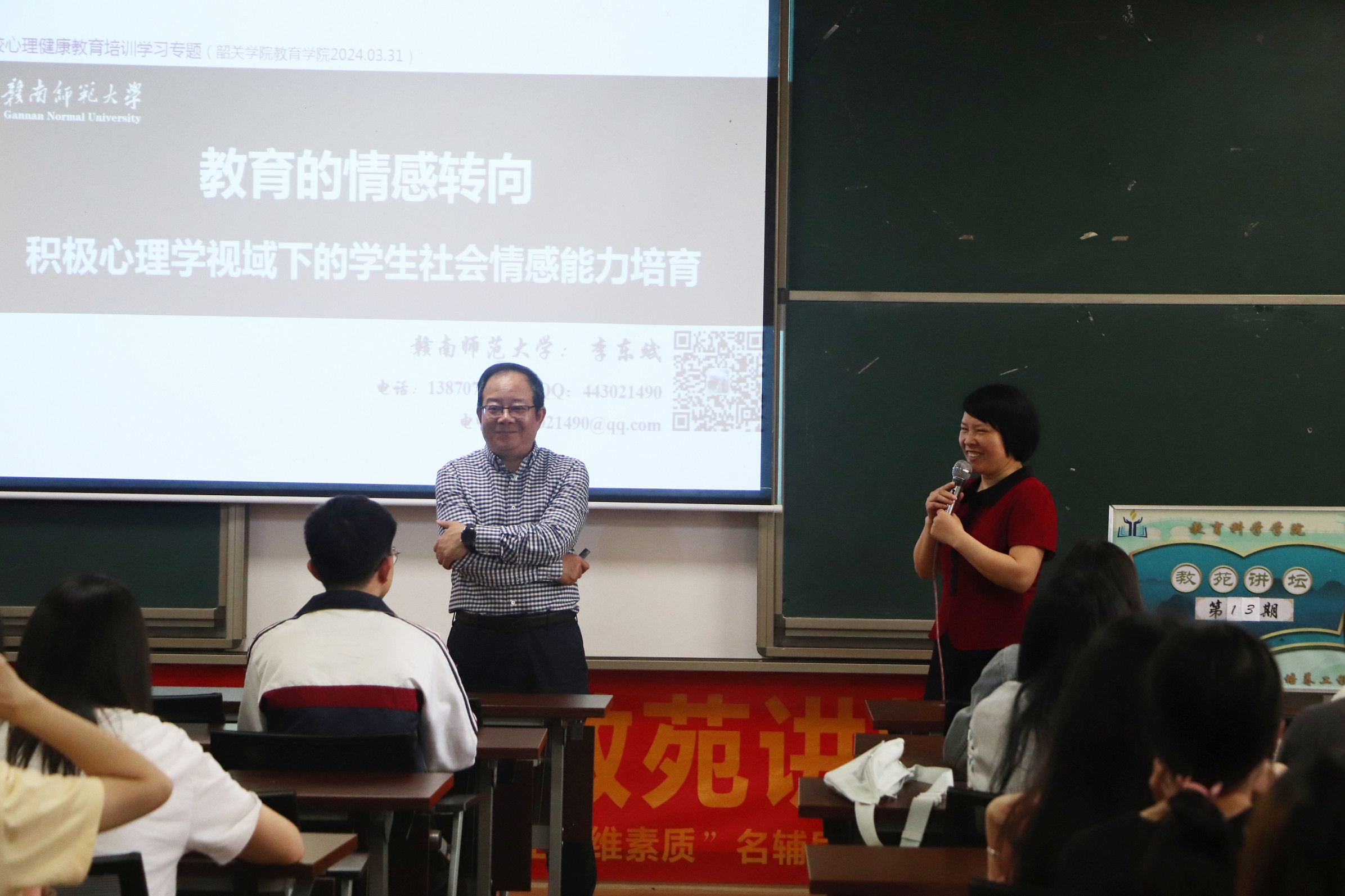 3月31日上午,教育科学学院在知礼楼204举办第13期“教苑讲坛”之“教育的情感转向:积极心理学视域下的学生社会情感能力培育”主题讲座。讲座邀请赣南师范大学李东斌教授担任主讲嘉宾。教育科学学院心理学系主任谭红秀老师及60余名学生参加本次讲座。