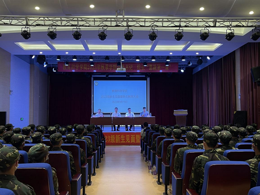 2023年9月19日晚,教育科学学院举行2023级新生见面暨新生教育大会。大会分设知行区知书楼113演播厅主会场和知礼楼202、203、207网络同步直播分会场。学院党委书记杨建新、院长王彦才、副院长吕伟及各系系主任、新生班主任、全体辅导员出席本次大会。