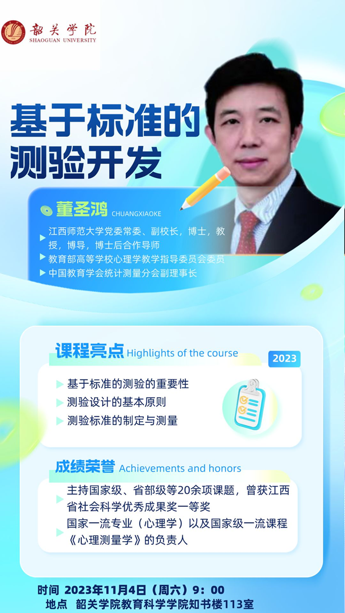主讲人介绍:董圣鸿,江西师范大学党委常委、副校长,博士,教授,博导,博士后合作导师;教育部高等学校心理学教学指导委员会委员,中国教育学会统计测量分会副理事长。主持了国家级、省部级等20余项课题,曾获江西省社会科学优秀成果奖一等奖;是国家一流专业(心理学)以及国家级一流课程《心理测量学》的负责人。