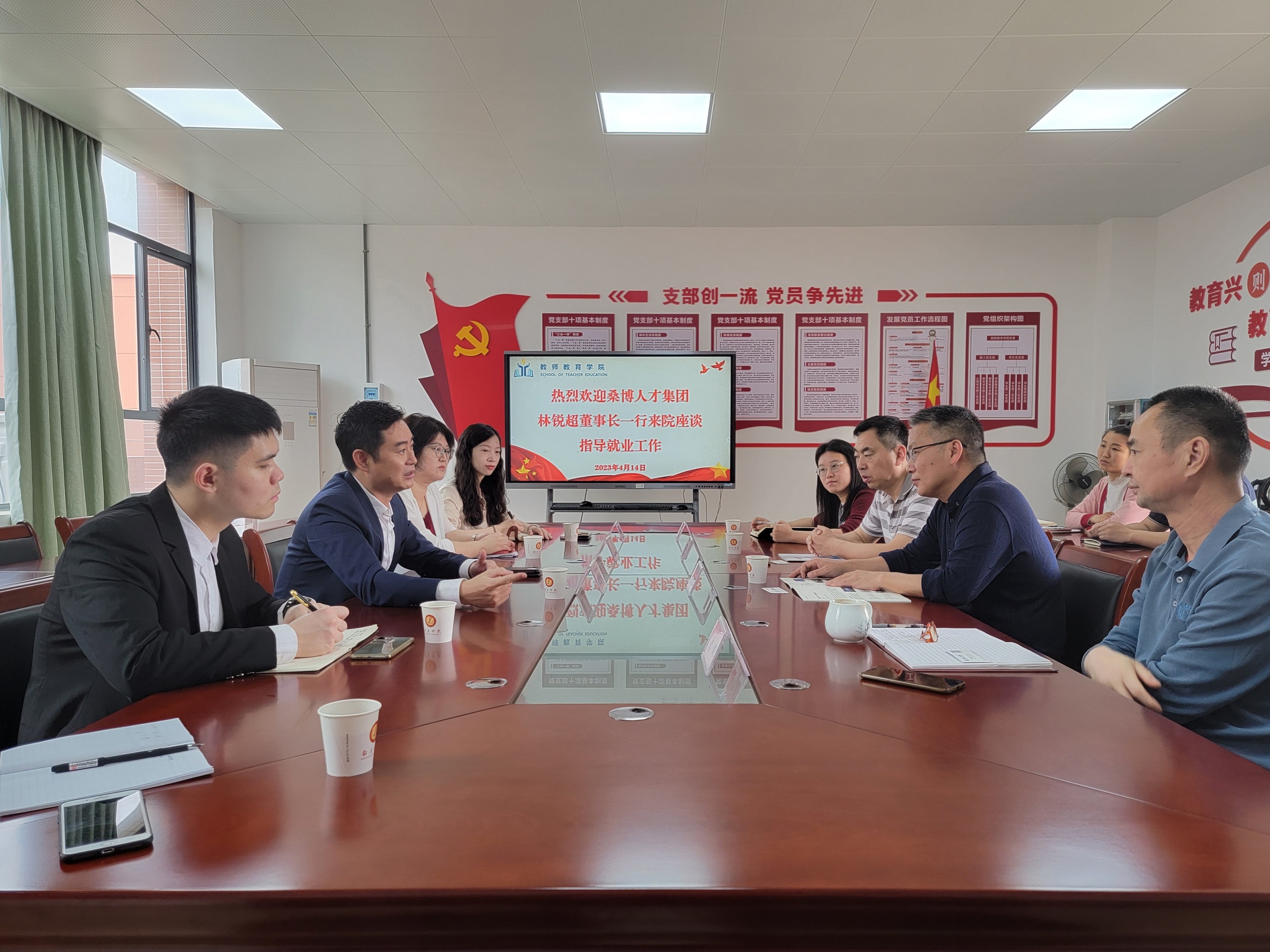 4月14日,桑博人才集团董事长林锐超一行到教师教育学院座谈交流就业工作。教师教育学院党委书记杨国强、执行院长王彦才、党委副书记曾健、副院长张雯闻等学院领导,以及校友办公室副主任罗会欢出席本次座谈会。