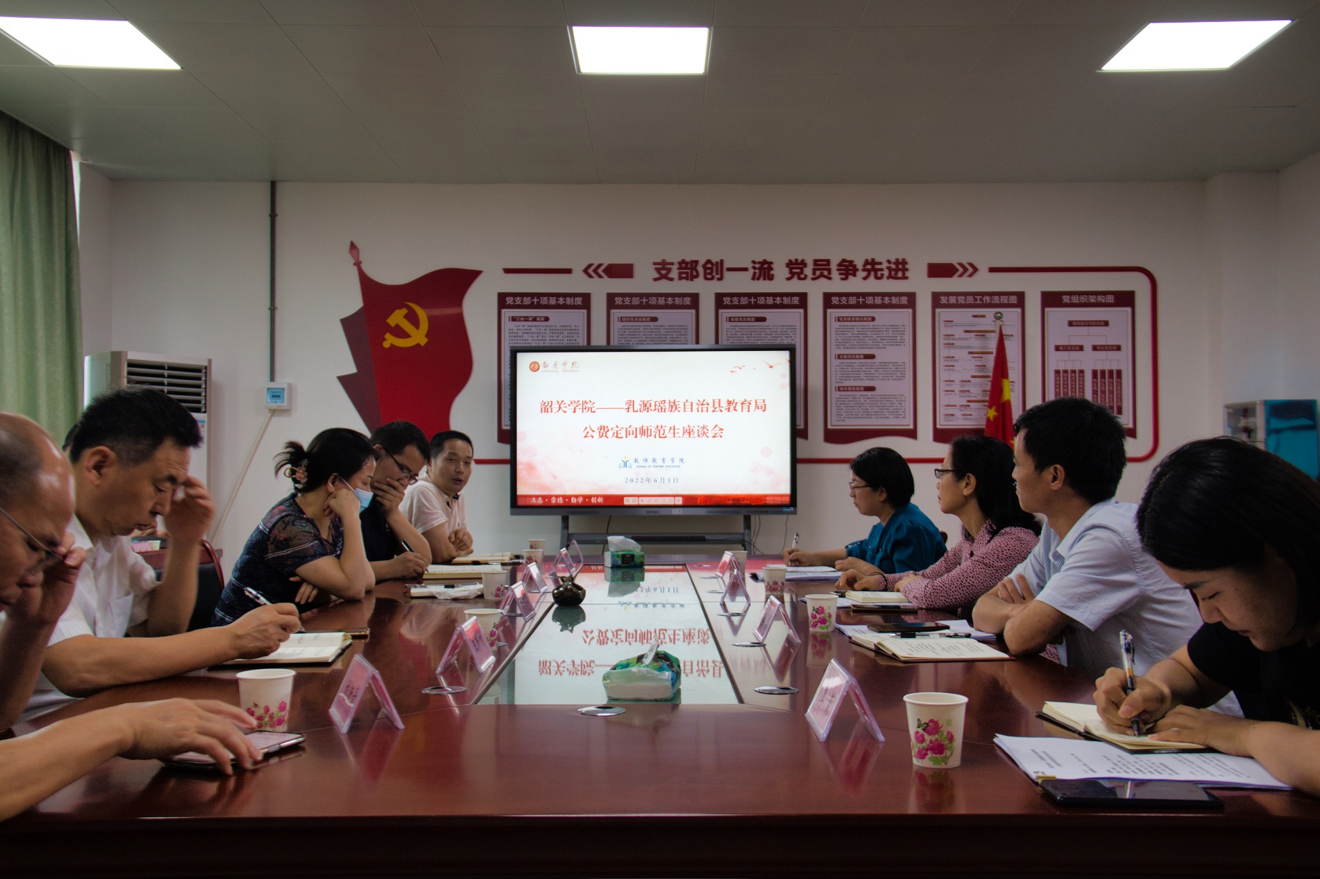 6月1日,乳源瑶族自治县教育局局长付慧燕等一行来学院座谈交流,教师教育学院党委书记杨国强、教育学部常务副主任肖华茂热情接待了来宾。双方就公费定向师范生培养、实习等工作开展座谈交流。教师教育学院、教育学部相关人员、美术与设计学院、音乐与舞蹈学院、体育学院相关负责人及乳源公费定向师范生参加座谈。