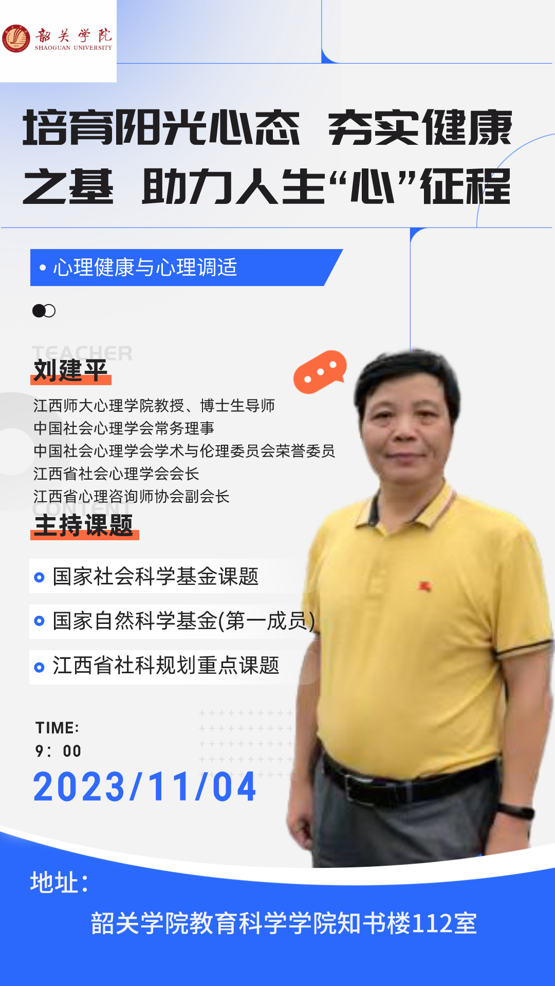 主讲人介绍:刘建平,江西师范大学心理学院教授、博士生导师。高校教龄四十年。曾任江西师范大学教务处副处长、江西师范大学工会主席、江西师范大学教育学院党委书记、江西师范大学心理学院党委书记。学术兼职有中国社会心理学会常务理事,中国社会心理学会学术与伦理委员会荣誉委员,江西省社会心理学会会长,江西省心理咨询师协会副会长。主持过国家社会科学基金课题、国家自然科学基金(第一成员)、江西省社科规划重点课题、江西省高校人文社科重点课题、江西省教改重点课题,发表论文、出版专著若干。
