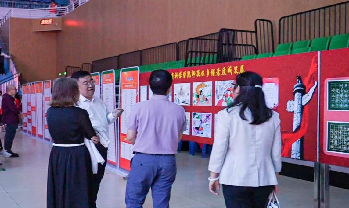 会前,出席本次汇演的相关部门领导和全体学生参观了学院名辅导员工作室、师德养成、学生奖励、师范生多维素质拓展等“三全育人”成果展。