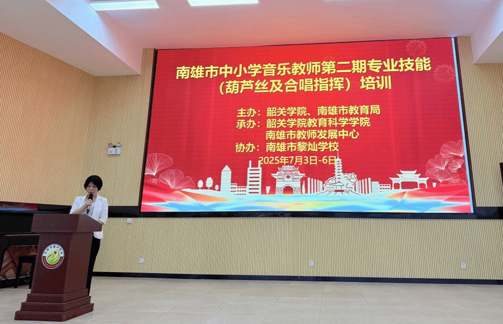 为深入贯彻落实高校“双百行动”及纵向帮扶工作部署,扎实推进教育科学学院纵向帮扶“三所学校”及县中质量提升工程,全面提升南雄市中小学音乐教师的专业素养与美育实践能力,7月3日上午,由韶关学院教育科学学院精心指导、南雄市教师发展中心主办的“南雄市葫芦丝及合唱指挥专项培训”开班仪式在南雄市教师发展中心隆重举行。本次培训聚焦“音乐美育与心灵教育深度融合”的核心目标,旨在通过专业赋能,助力南雄市中小学构建高质量音乐教育体系。南雄市教育局相关领导、韶关学院教育科学学院代表、培训专家及全市中小学音乐骨干教师参加了仪式。