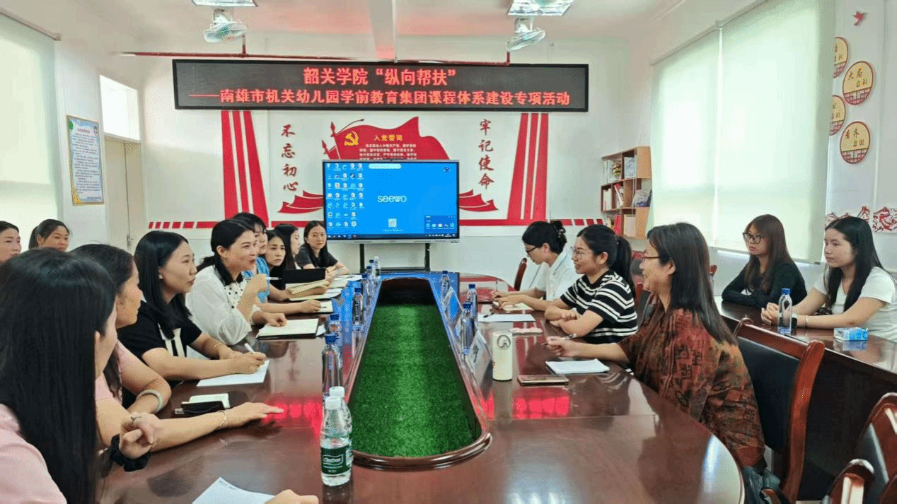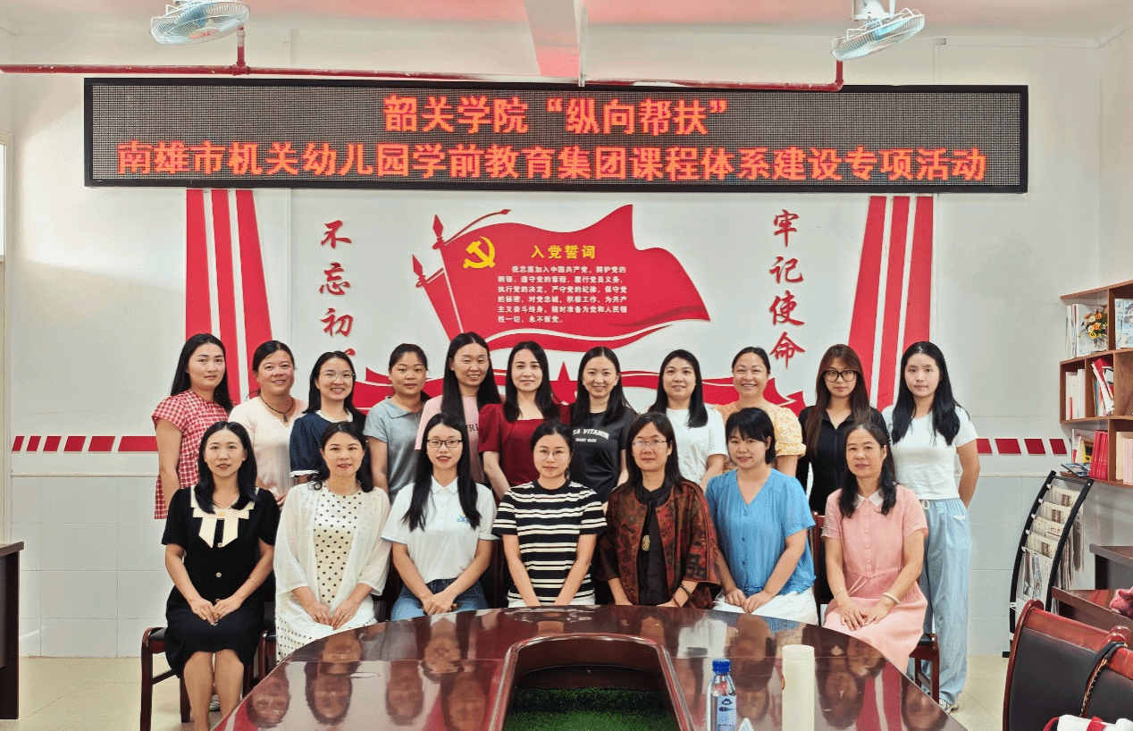 为贯彻落实广东省纵向帮扶及"双百行动"工作部署,推动县域学前教育高质量发展,7月15日,韶关学院教育科学学院学前教育专家肖文博士、钟雪梅、易静带领团队赴南雄市机关幼儿园学前教育集团开展专项帮扶活动。