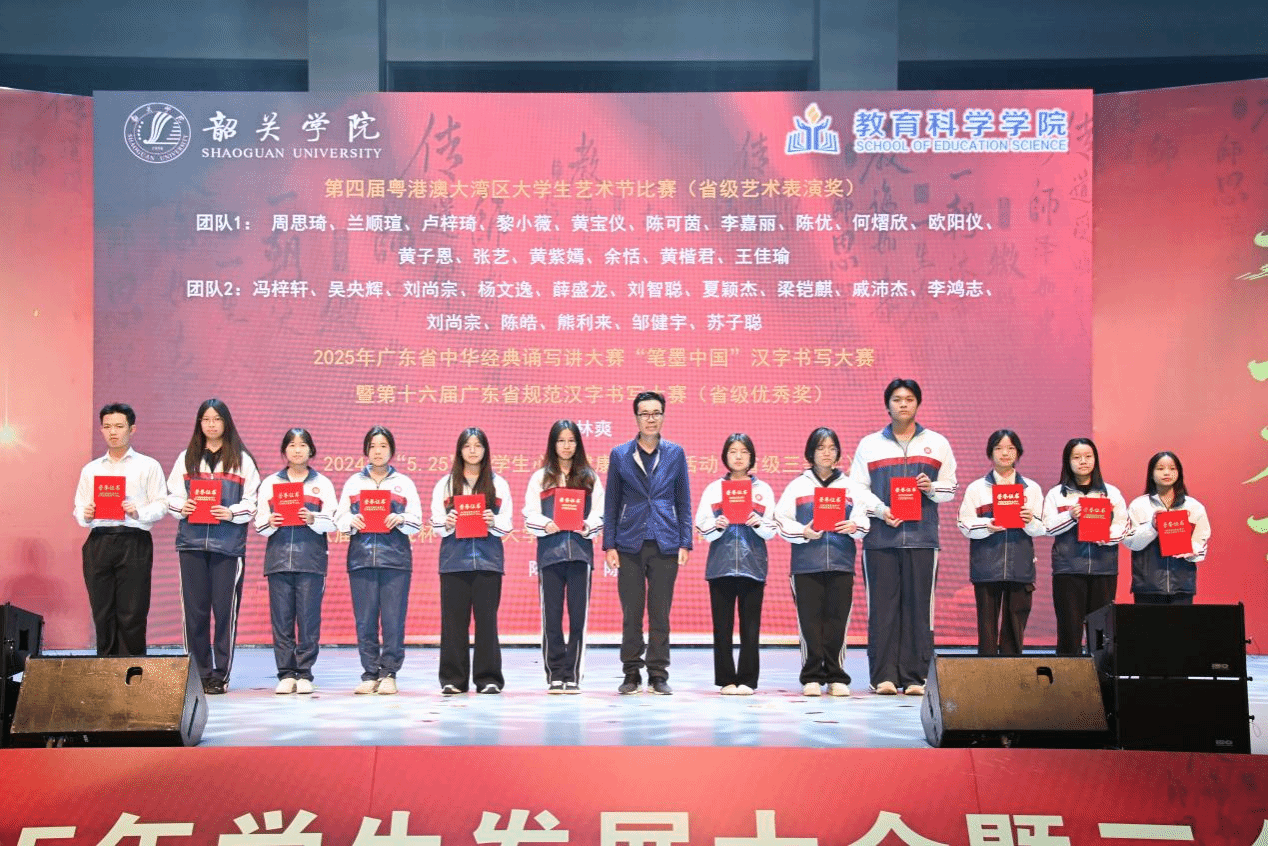 主持人逐项宣读表彰决定,领导嘉宾分别为获奖学生和集体颁奖。本次大会对我院在2025年度获得国家奖学金、国家励志奖学金,以及在科创竞赛、专业技能大赛、志愿服务、心理健康类赛事、文体活动、粤港澳大湾区相关赛事等多个领域表现出色的多位优秀学生和优秀集体进行了表彰,充分展现了教育科学学院“三全育人”成果及“五育并举”的多维素质培养成效。