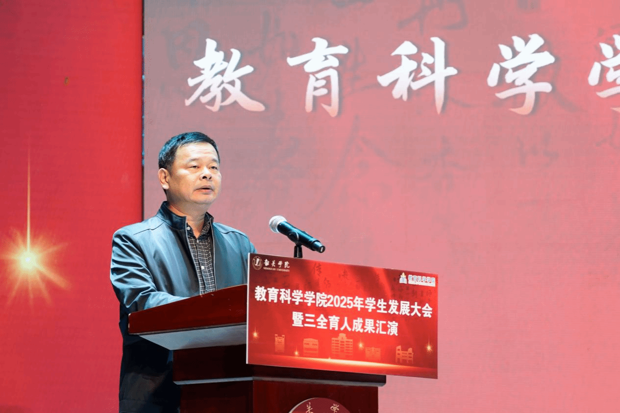 为深入推进“三全育人”工作,落实“五育并举”育人要求,厚植师范生教育家精神,强化学生综合素养与集体凝聚力,教育科学学院于12月8日在西区体育馆举行了2025年学生发展大会暨三全育人成果汇演,学院党委书记杨建新,校团委副书记(主持工作)邓明长,宣传部副部长、新闻中心副主任蓝骏东,学生工作部副部长何振环,学院党委副书记徐文渊,商学院学工办主任古丽萍,全体班主任、社团指导老师、辅导员以及全体教育科学学院在校生共同参加。