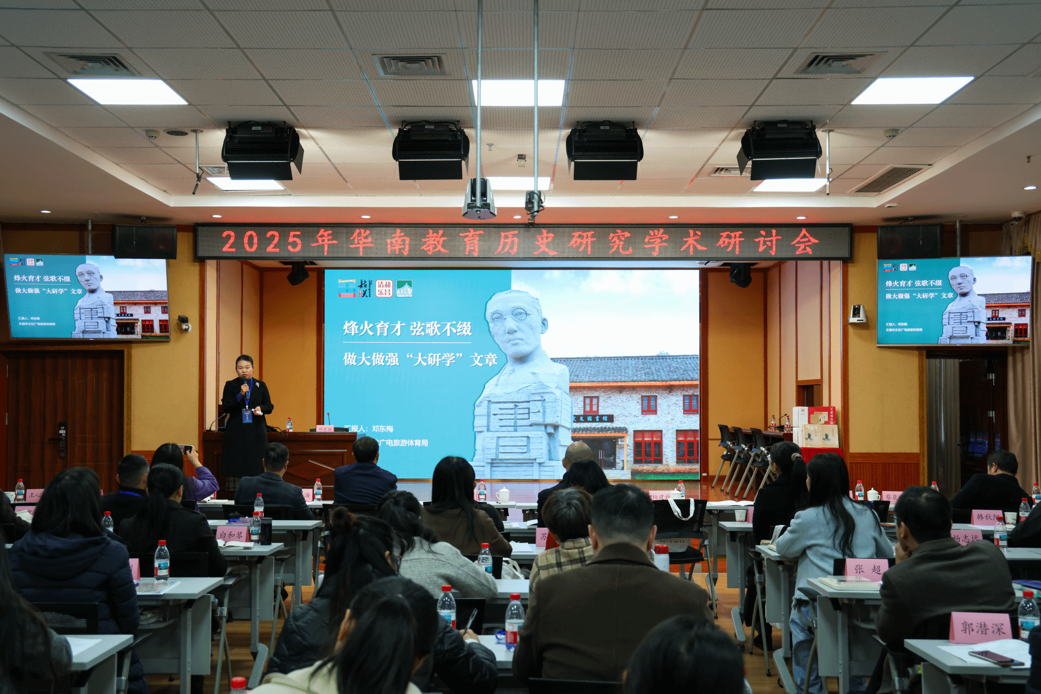 12月13日,由韶关学院粤北华南教育历史研究中心主办、韶关学院教育科学学院承办的2025年华南教育历史研究学术研讨会在我校顺利召开。本次研讨会主题为“追寻华南教育历史 传承教育报国精神”,韶关市文化广电旅游体育局、市社会科学联合会、市文学艺术界联合会、浈江区文化旅游体育局、乐昌市文化广电旅游体育局、乐昌华南研学专班有关领导、相关专家及我校研究人员60多人参加。韶关学院党委副书记吴善添出席会议并致开幕词。