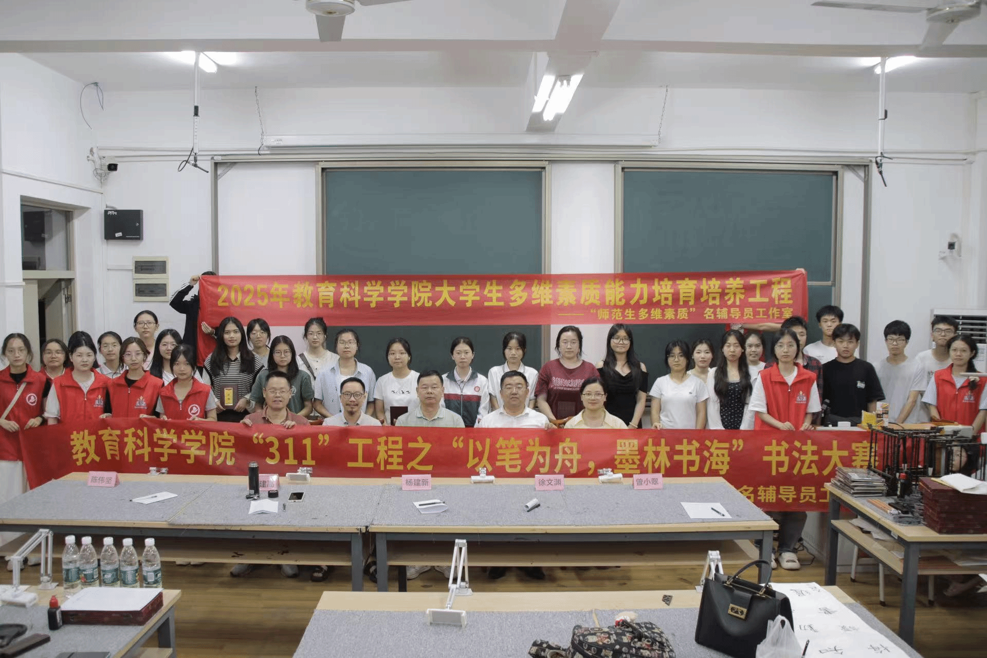 教育科学学院于5月10日晚在知书楼举办“311”工程之“以笔为舟 墨林学海”书法比赛。学院党委书记杨建新、副书记徐文渊、“311”工程书法指导老师朱建高、陈伟坚和“师范生多维素质”名辅导员工作室主持人曾小翠出席本次比赛。