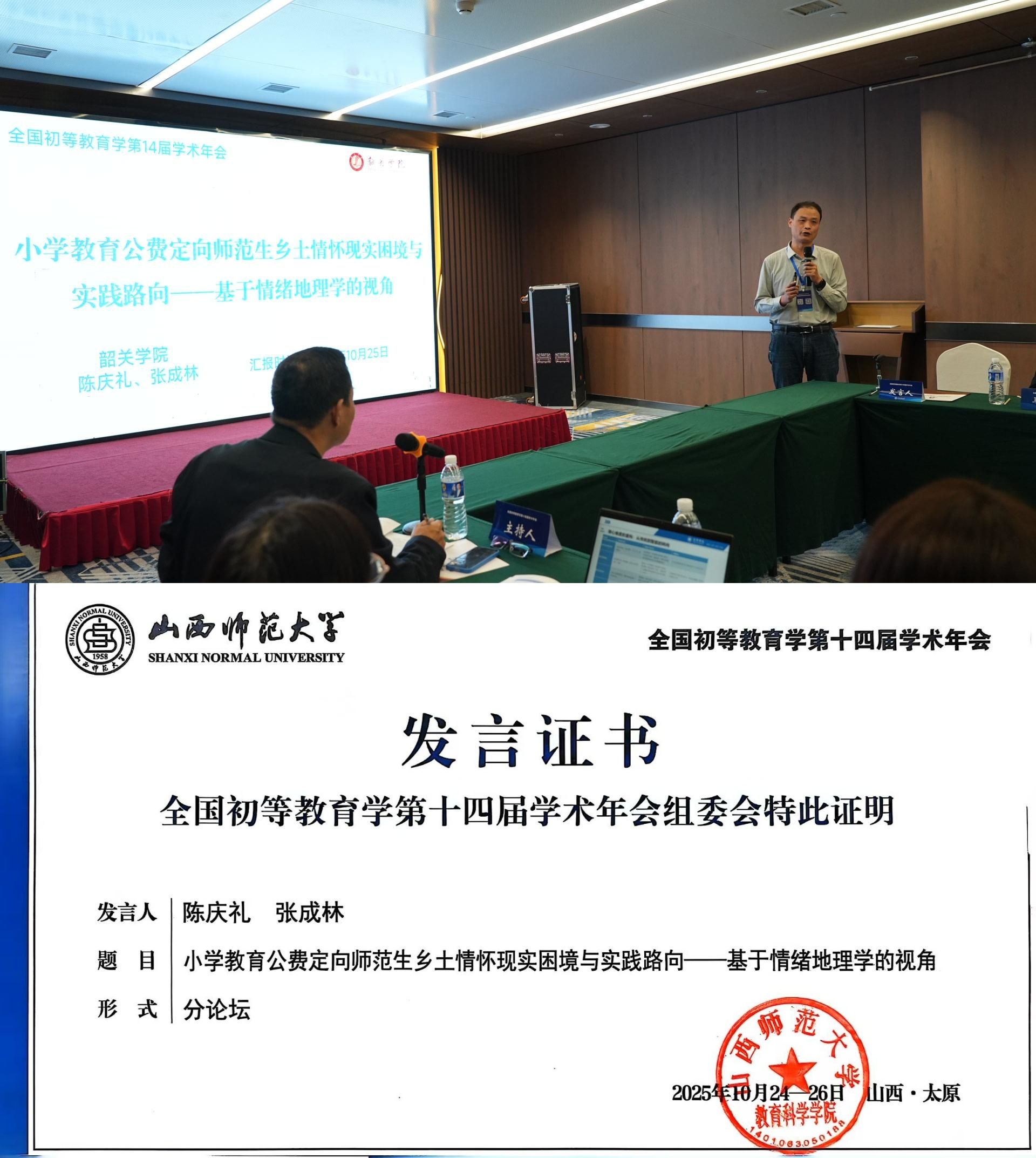 年会以“教育强国建设进程中高校小学教育专业综合改革研究”为核心主题,围绕培养目标与规格、课程教材建设、教学创新、教育实习、专业认证等八大关键议题,通过主旨报告、分论坛研讨等形式搭建高端学术交流平台。分论坛交流中,我院教师精准对接会议核心议题精彩发声:陈庆礼老师在分论坛一作《小学教育公费定向师范生乡土情怀现实困境与实践路向——基于情绪地理学的视角》报告,聚焦乡村教育人才培养痛点,结合理论提出实践方案,为优化公费师范生培养提供新路径;杨莲老师在分论坛三以《教育实习对师范生职业认同感影响的实证研究——以韶关学院小学教育专业为例》为题,分享本校实证研究成果,为高校深化教育实习改革、强化师范生职业认同提供了鲜活参考。