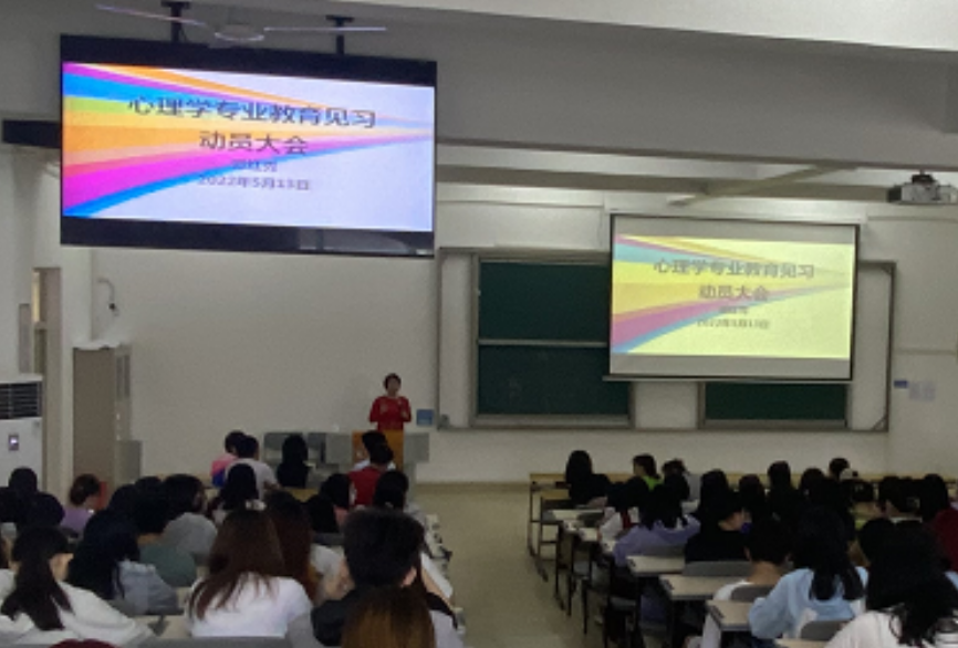 2022年5月13日,教师教育学院心理学专业在知行区知遇楼(原韶师三号楼)112教室开展教育见习动员大会,2019级、2020级及2021级心理学专业210名学生参加大会。大会由心理学系主任谭红秀老师主持,廖素群、方必基、彭家欣、曾灿、徐广荣等5位老师出席了本次大会。
