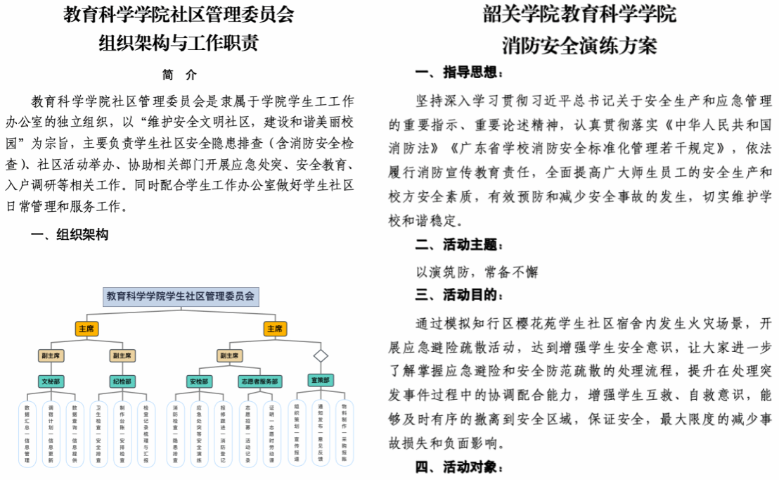 学院成立了社区管理委员会,修订了《学院学生管理办法》《学院消防安全应急处理预案》《消防安全演练工作方案》《学生宿舍管理办法》等社区管理相关文件近10项。2024年度学生宿舍检查结果显示樱花苑宿舍4星率超80%,每周“安全文明卫生检查”排名位列全校前3。