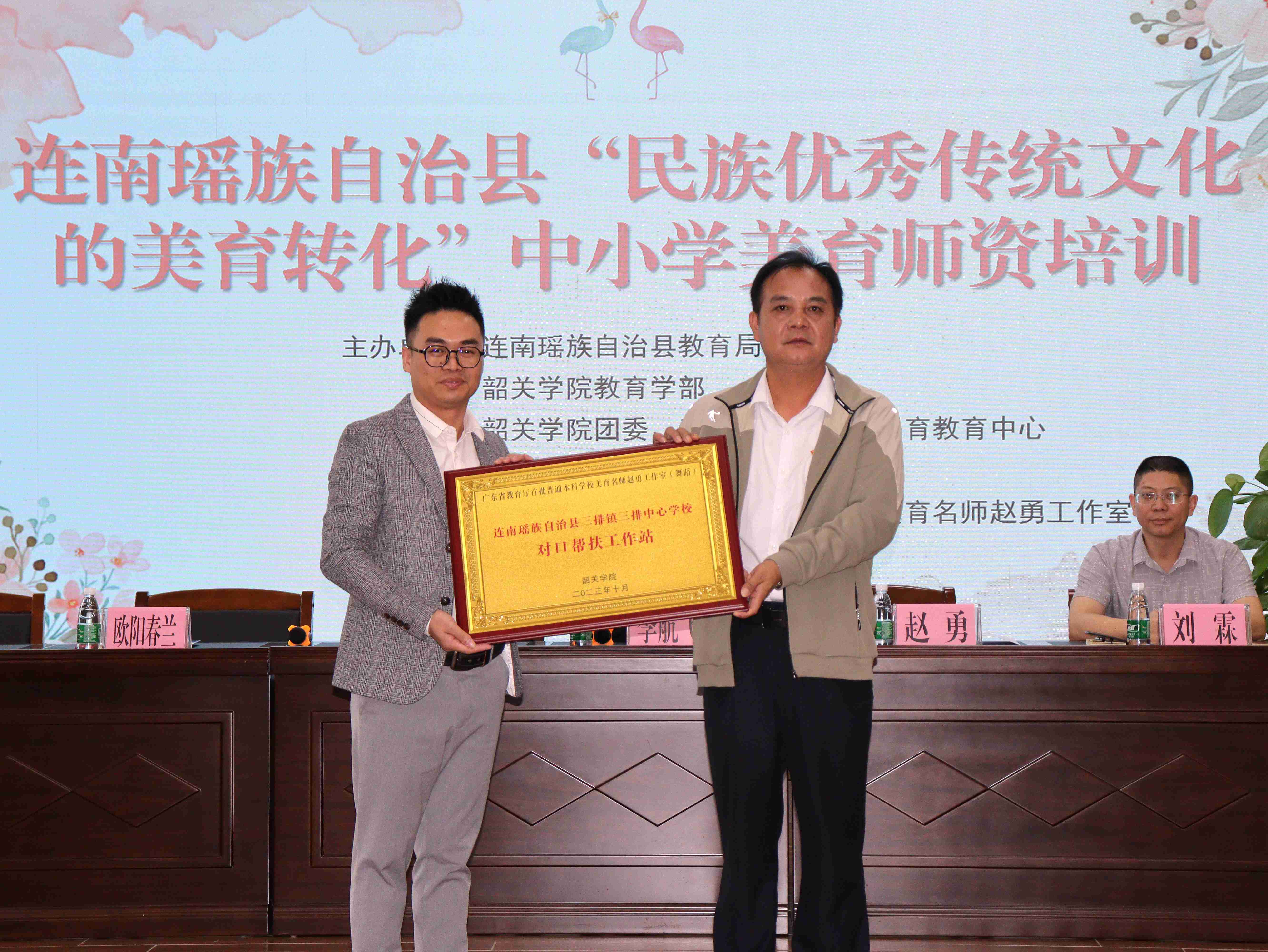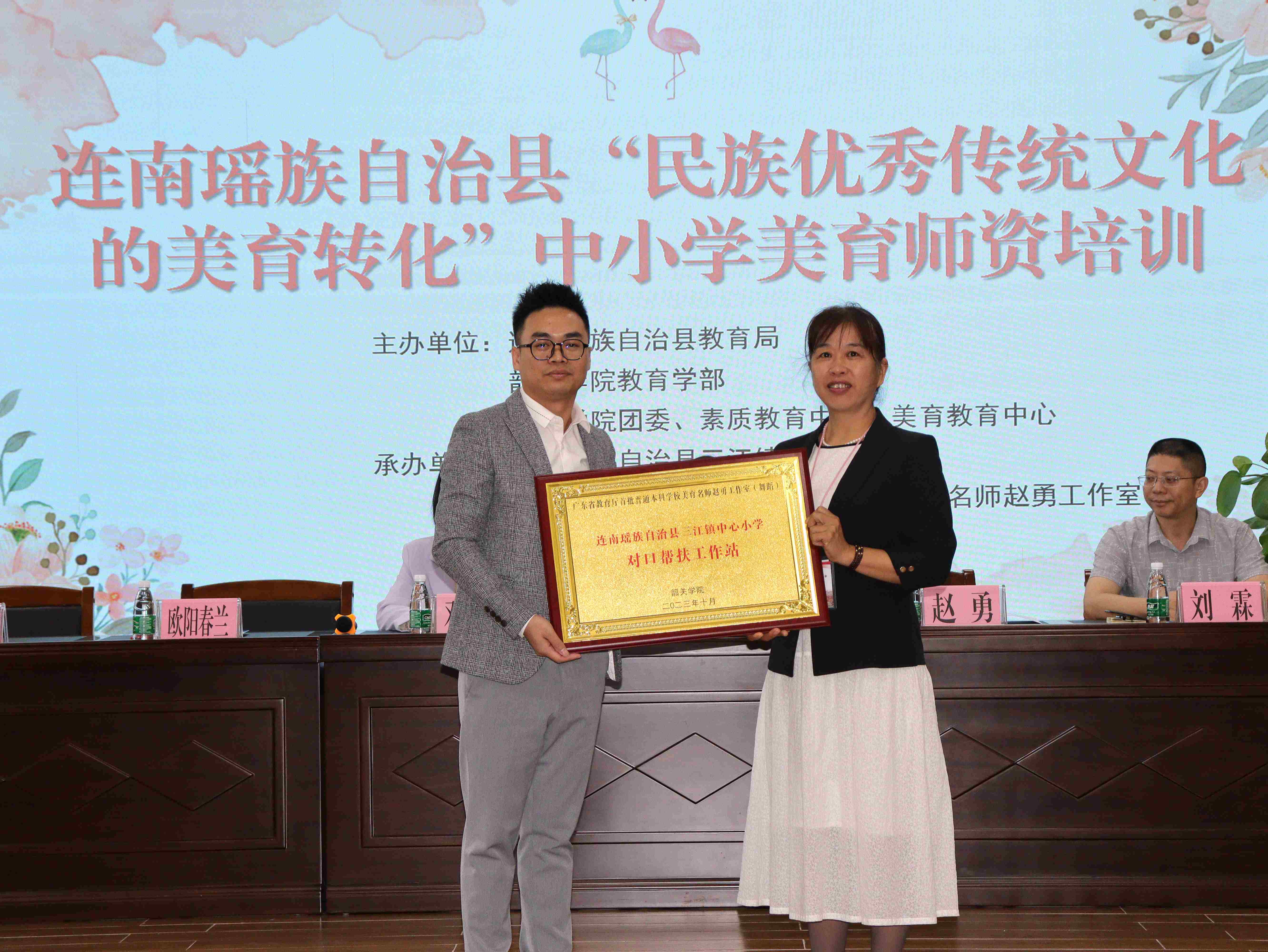 我校广东省教育厅首批普通本科学校美育名师工作室(舞蹈)主持人赵勇与帮扶学校三江镇中心小学校长欧阳春兰、三排镇三排中心学校校长唐罗贵进行美育对口帮扶授牌。