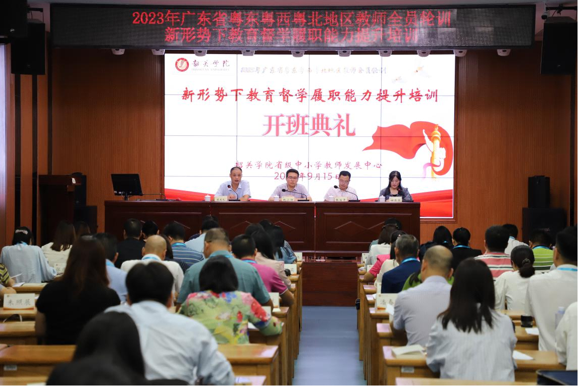 为贯彻落实《中共广东省委广东省人民政府关于推动基础教育深化改革高质量发展的意见》(粤发〔2020〕6号)、《广东省人民政府关于印发广东省推动基础教育高质量发展行动方案的通知》(粤府〔2021〕55号)、《广东省教育厅关于印发广东省粤东粤西粤北地区中小学教师全员轮训实施方案的通知》(粤教师〔2022〕7号)、《广东省教育厅关于做好2022年新强师工程中小学幼儿园(含特殊教育)教师、校(园)长省级培训工作的通知》等文件精神,2023年广东省粤东粤西粤北教师全员轮训--新形势下教育督学履职能力提升培训班于9月15日在韶关学院省级中小学教师发展中心(以下简称“发展中心”)正式开班。开班典礼由发展中心培训与管理部谢晶晶主持,信息与资源部科长赵小河、清远市教师发展中心教研员张治平、韶关学院教育科学学院博士陈庆礼出席了开班典礼。