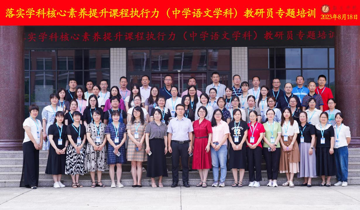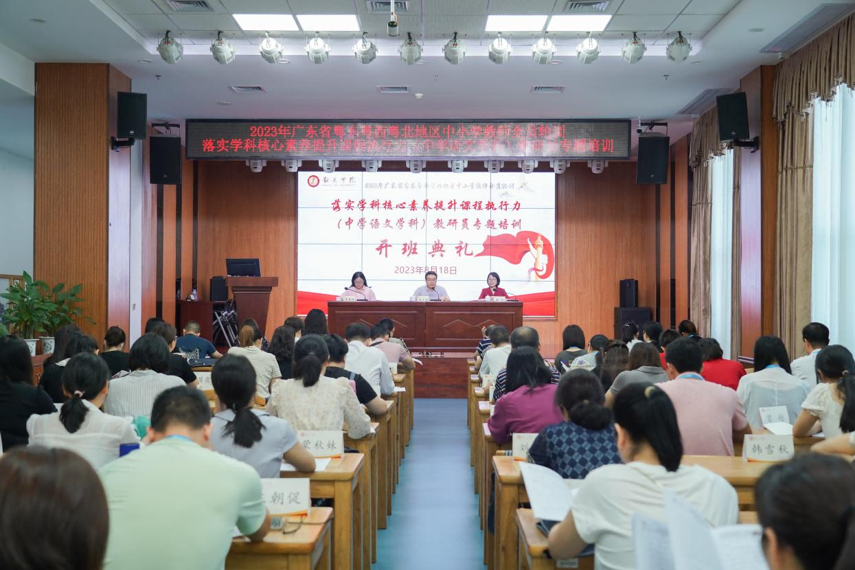 为全面落实省委、省政府关于推动基础教育深化改革高质量发展的工作要求,促进粤北地区中学语文教研员与教研骨干全面把握和落实学科核心素养的要求,优化教学设计能力,提升课程执行力和教研组织能力,2023年广东省粤东粤西粤北地区中小学教师全员轮训—落实学科核心素养提升课程执行力(中学语文学科)教研员专题培训班于2023年8月18日上午在韶关学院省级中小学教师发展中心(以下简称“发展中心”)举行开班典礼。