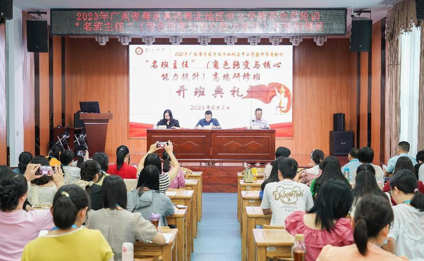 为促进我省基础教育均衡发展,有效提高粤东粤西粤北地区中小学教师教育教学能,8月7日下午,由韶关学院省级中小学教师发展中心(以下简称“发展中心”)承办的2023年广东省粤东粤西粤北地区中小学教师全员轮训“名班主任”(角色转变与核心能力提升)高端研修班在发展中心举行开班典礼。出席开班典礼的有韶关学院省级中小学教师发展中心副主任余志兵、首席专家廖圣河博士、发展中心韦惠玲老师以及来自清远市的50位中小学班主任。