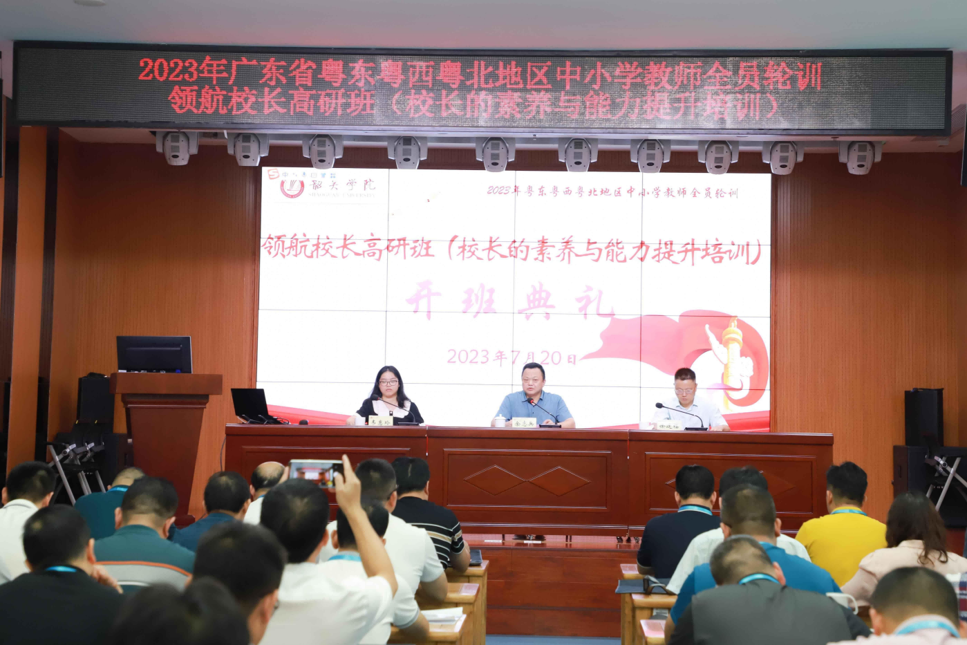 2023年7月20日下午,韶关学院省级中小学教师发展中心(下称“发展中心”)在蔡志明楼一楼智慧课室举行了“领航校长”(校长的素养与能力提升)高端研修班开班仪式。发展中心副主任余志兵、首席专家徐廷福和来自清远市各县(市、区)的120位校长参加了开班仪式。本次开班仪式由发展中心韦惠玲主持。