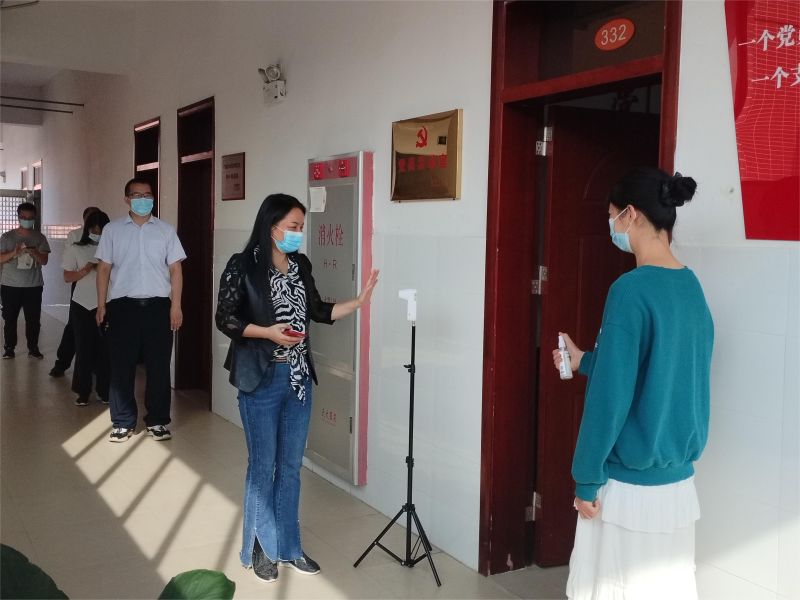 本次演练采用模拟每日防控常态举措演练方式,所有人员戴好口罩,手持健康码,并保持一米左右间距,进行体温监测。消杀组对人员手部进行消毒,对物品进行消毒。在测温过程中,发现一名人员体温超过37.3度,由应急处置成员将其带到临时观察室,校医对该其进行询问有无其他不适、家庭成员健康情况、近期有无外出经历等,应急处置组通知学校防控办,并派车将该人员送去医院就诊。同时封闭该通道并对该通道进行全面消毒,所有人员转为另一通道入办公楼。