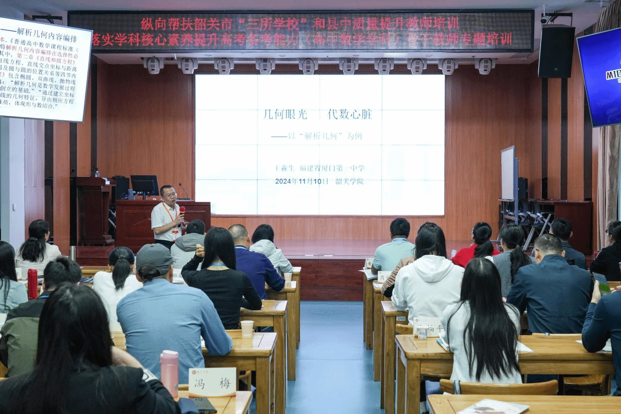 为深入贯彻落实省教育厅关于师范院校纵向帮扶欠发达地区“三所学校”和县中质量提升工作部署,11月7日至11日,由我校和韶关市教育局联合举办的纵向帮扶韶关市“三所学校”和县中质量提升教师培训——落实学科核心素养提升高考备考能力(高中数学学科)骨干教师专题培训在我校省级中小学教师发展中心顺利举办,来自韶关市各高中的80名数学学科骨干教师参加培训。
